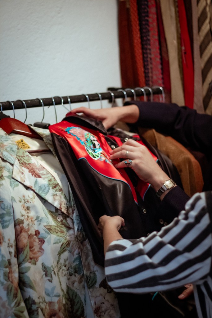 La conversación con Nick nos llevó hasta un paseo por su estudio de prendas vintage que dio como resultado “I was a tenage dandy”, una galería enfocada en la difusión de la elegancia vintage en la Ciudad de México. Nos mostró algunas de las prendas que forman parte del estudio, provenientes de décadas como los 70, 50, 40 o 30, con diferentes inspiraciones y características únicas, como aquella chamarra elaborada en suave piel en la década de los 70, y que en su versión masculina tiene un bolsillo oculto en el pie de cuello para guardar “la magia”, o una chaqueta militar de la época del presidente Dwight Eisenhower.