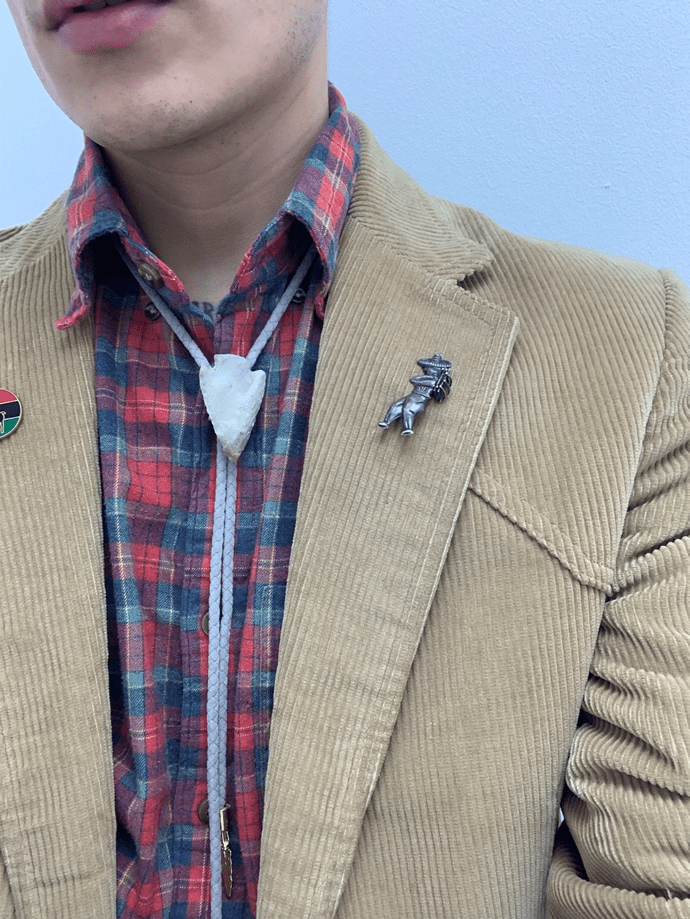 Adquisiciones durante el mes: Cinturón de conchos, corbatín de punta de flecha, polo azul marino.