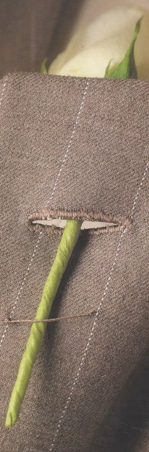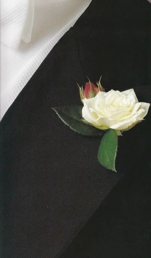En el caso de agregar una flor a la solapa, esta debe ser natural y provenir del ramo de la novia. Utilizar botonier no es aceptable en estos casos (y realmente en ninguno), un fistol tampoco tiene sentido en el discurso que se busca lograr en el look para el día de la boda.
